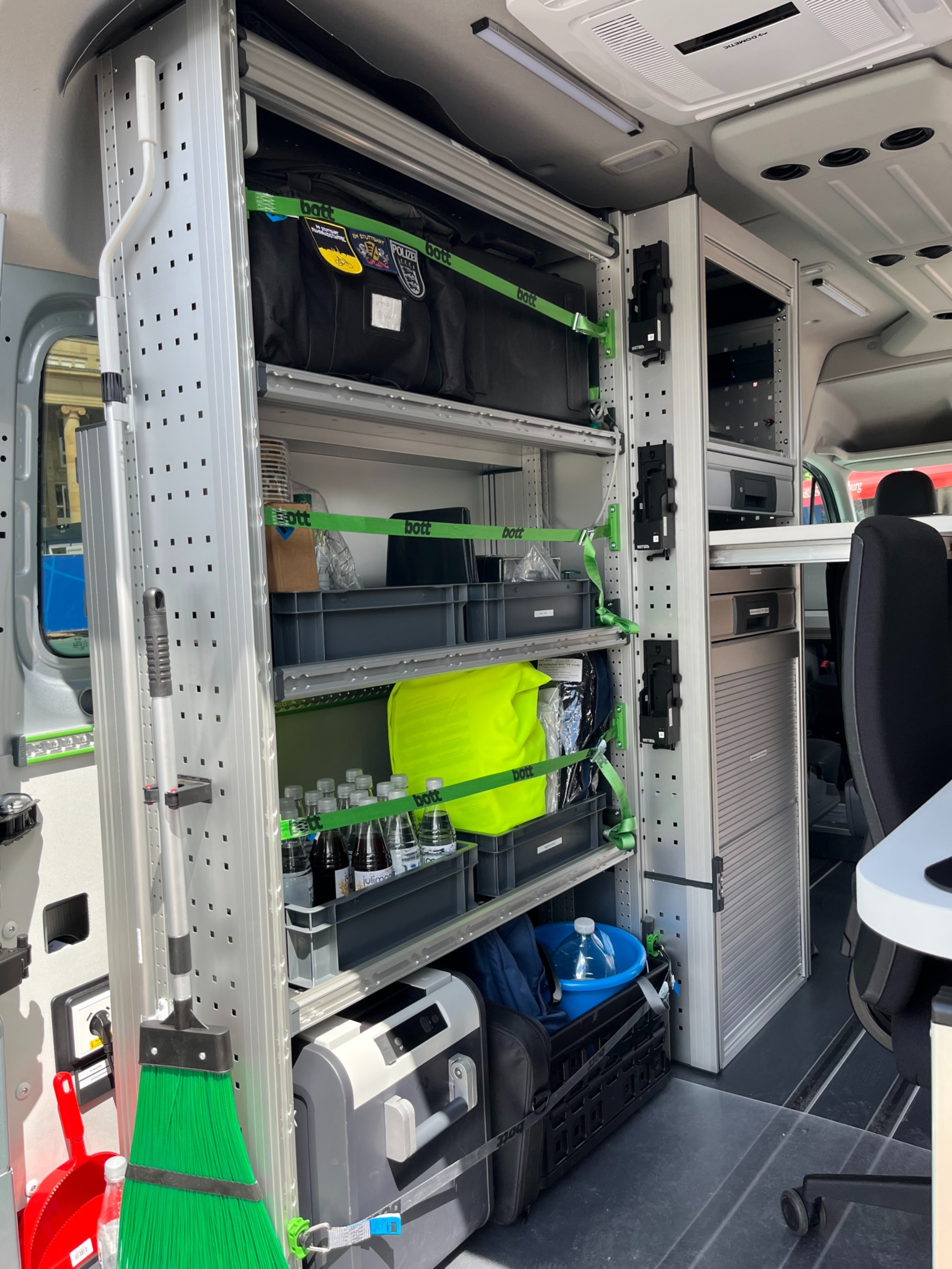 Die Polizei Stuttgart sorgt Tag und Nacht für die Sicherheit aller Bürger. Was viele Menschen für selbstverständlich nehmen, ist für die Einsatzkräfte nicht immer leicht. Mit der neuen Mobilen Wache – ausgestattet mit bott vario3 Fahrzeugeinrichtung – sind die Polizisten rasch und unkompliziert an den Orten im Einsatz, an denen ihre Unterstützung benötigt wird. Das Fahrzeug soll nicht nur bei Großveranstaltungen und Versammlungen, sondern auch auf Wochenmärkten und an lokalen Kriminalitätsschwerpunkten eingesetzt werden. So können die Polizeibeamten im öffentlichen Raum schnell, flexibel und professionell auf unterschiedliche Sachverhalte reagieren.